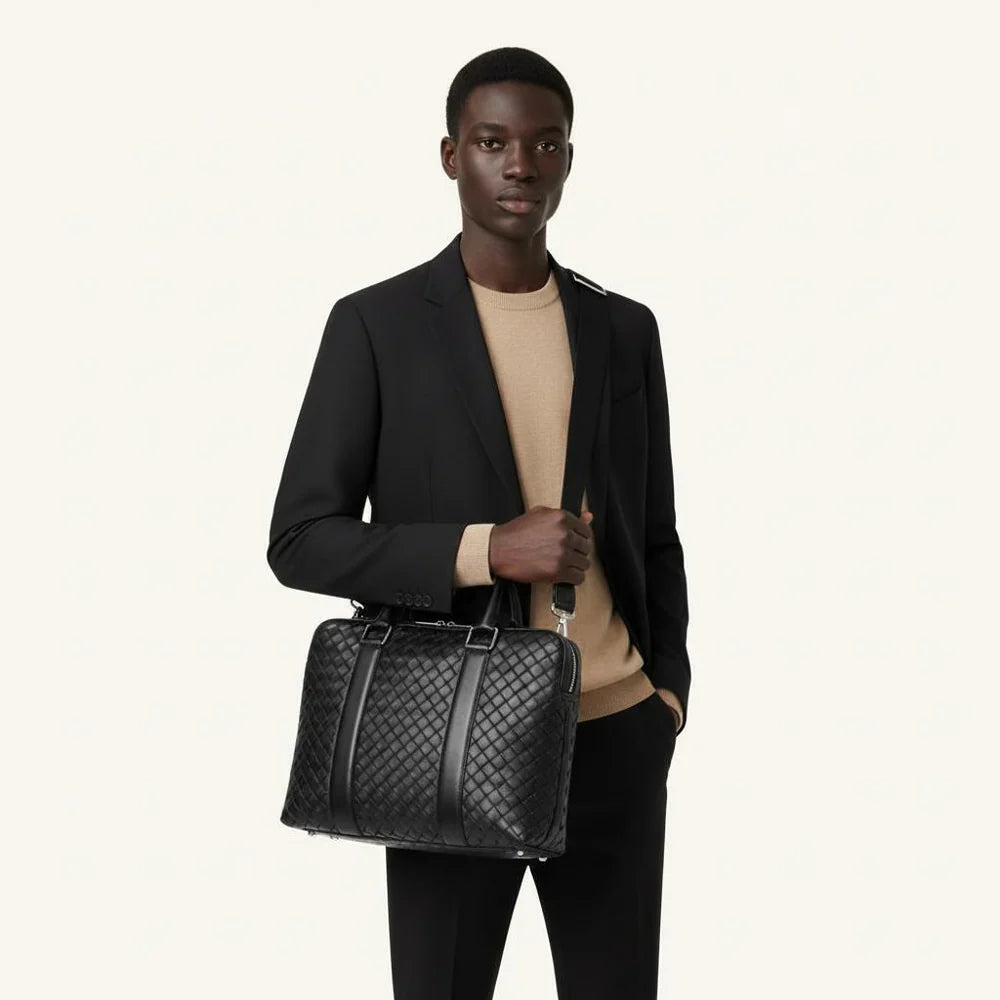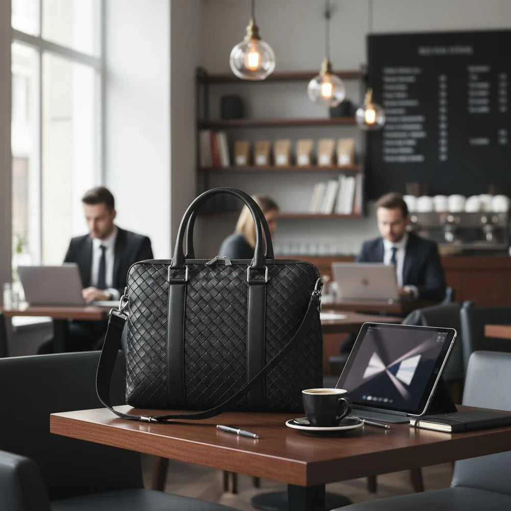 Elle est fabriquée à partir de cuir vegan 100 % haut de gamme avec une texture inspirée du tissage, offrant une finition durable, structurée et professionnelle.